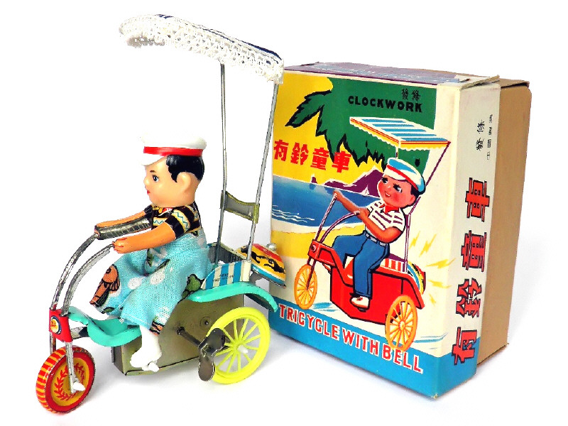 longueur 14 cm - réalisation en tôle lithographiée - moteur à ressort & sonnette sonore (fonctionnent) - avec conducteur en tôle - version avec 1er type de boîte - fabrication des années 1970-1980