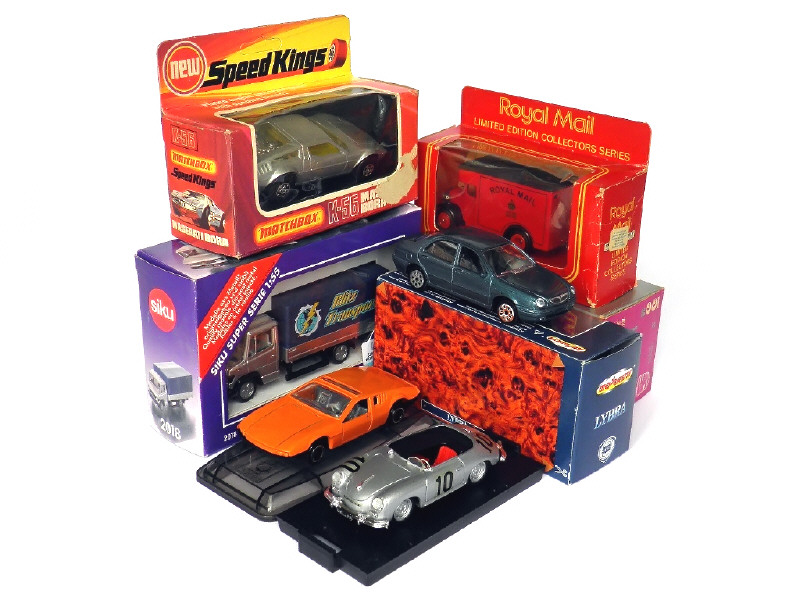 miniatures reproduisant les modèles : MASERATI BORA, DE TOMASO PANTHERA, LANCIA LYBRA, PORSCHE 356, DENNIS 'ROYAL MAIL' & MERCEDES VARIO - on y retrouve les marques : MATCHBOX, PILEN ARTEC, MAJORETTE, BRUMM, LLEDO & SIKU