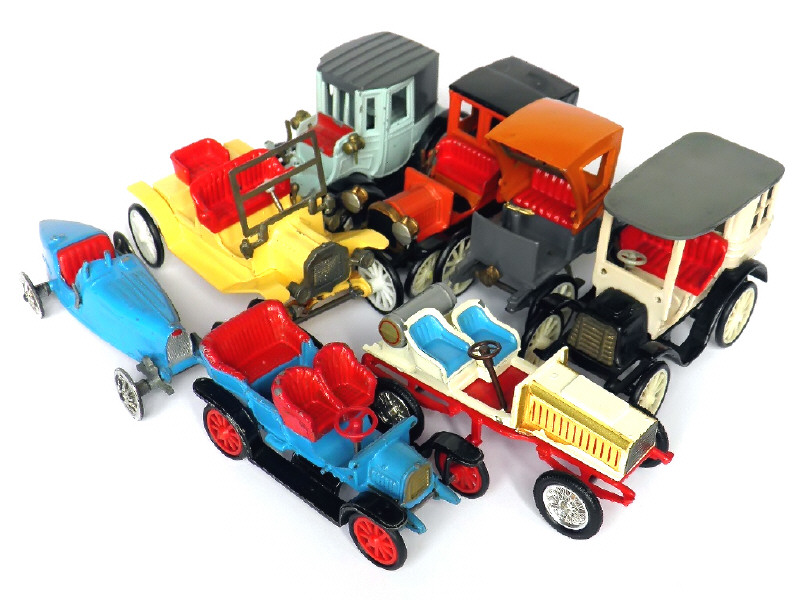 états de 'B' à 'F' - miniatures reproduisant les modèles : DEDION BOUTON, GAUTHIER WEHRLE, PANHARD LEVASSOR, LION PEUGEOT, PEUGEOT coupé, PACKARD, FORD T & BUGATTI - nombreuses pièces rapportées absentes