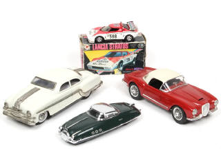 grande échelle - comprend : LANCIA STRATOS (boite en état 'c'), AURELIA & 2 modèles en tôle sans marque - on y retrouve notamment les marques : BBURAGO & EIDAIGRIP - quelques petites traces d'oxydation
