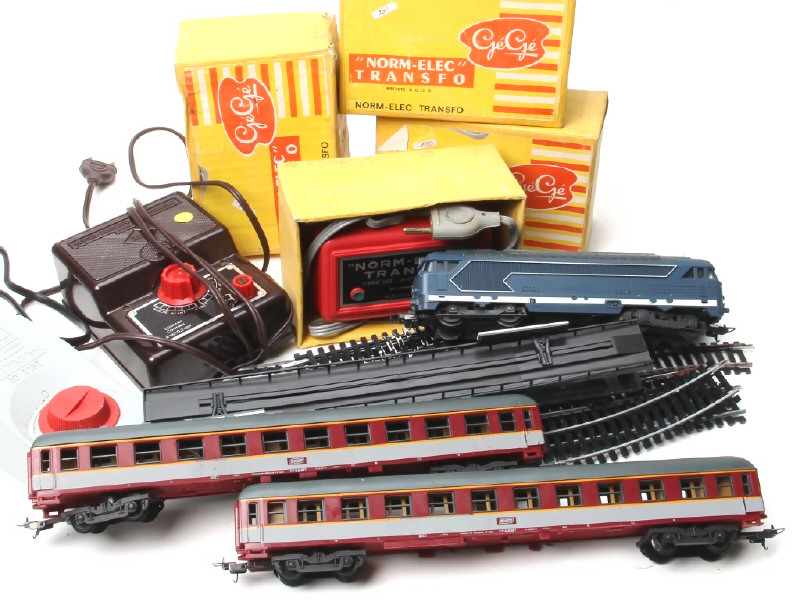 états de 'B' à 'C' - comprend : une motrice BB 67001 (non testé), 2 voitures voyageurs, un wagon porte-autos, 5 transformateurs dont 3 en boite & un petit lot de rails - on y retrouve les marques GEGE, LIMA & JOUEF - possibilité de parties cassées & manquantes