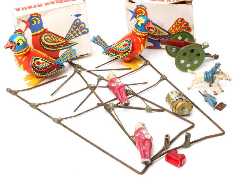 états divers - 2 oiseaux en tôle de fabrication russe avec leurs boites (état 'B.d'), moteurs à clef (fonctionnent) - un canon en tôle, 2 soldats en plomb creux, un jeu ancien avec 2 clowns à bascule en composition - on y joint quelques pièces détachées