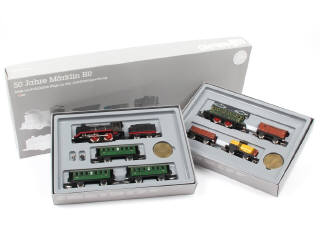non testé - présenté en 2 boites individuelles - contenu du premier coffret : locomotive à vapeur type 020 avec tender, 3 voitures de voyageurs de 3ème classe, 2 figurines & une médaille - second coffret : motrice électrique, 3 wagons de marchandises & une médaille - avec certificats d'authenticité