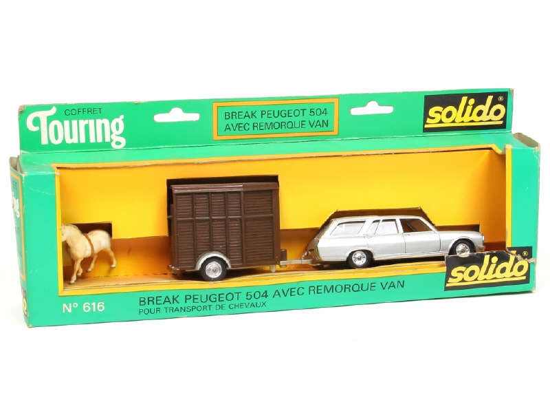 contient PEUGEOT 504 break & remorque-van THEAULT avec cheval - boîte plus ou moins décolorée avec blister manquant