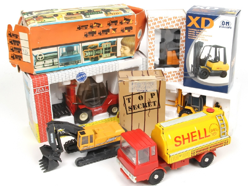 états de 'A' à 'C' - boites de 'a' à 'c' - comprend : 5 chariots élévateurs, un camion citerne & une pelle mécanique - on y retrouve notamment les marques : JOAL, C.P., CONRAD & PIMESPO - possibilité de petits manques & parties cassées