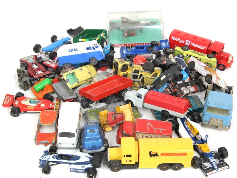 états divers - petite échelle - comprend notamment : citerne, BTP, voitures de sport, formules 1, avion & minibus - on y retrouve notamment les marques : POLITOYS, DAYS GONE, LONE STAR, CHAMPION, CORGI JUNIORS, ONYX & MATCHBOX - manques & parties cassées