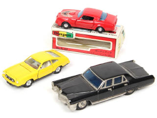 miniatures reproduisant les modèles : CADILLAC, PONTIAC (boite en état 'b') & FORD MUSTANG - carrosseries plus ou moins encrassées