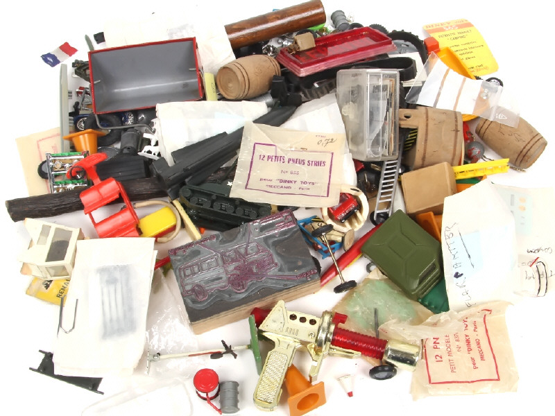 états divers - comprend notamment : missiles & rockets, chenilles, roues, tonneaux, moto, bidons, rabats de boites, figurines, pompe à essence etc. - on y retrouve notamment les marques : DINKY TOYS, HOTWHEELS & CORGI TOYS - possibilité de manques & parties cassées