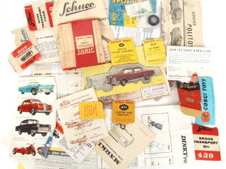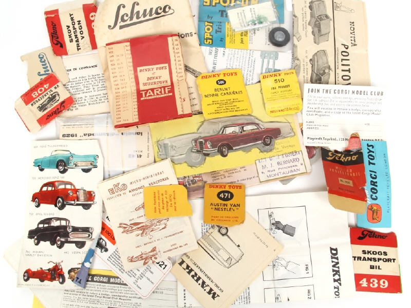 états divers - comprend : rabats de boites, notices & parties de catalogues - on y retrouve notamment les marques : CORGI, TEKNO, DINKY TOYS, SCHUCO, SPOT ON & POLITOYS - possibilité de petites déchirures, crayonnages & manques