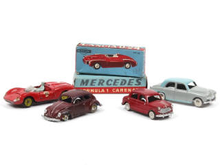 comprend les modèles : VOLKSWAGEN COCCINELLE, ALFA ROMEO 1900 (parties de carrosserie non repeintes), FIAT 1100 & DINO SPORT (en état 'E') - avec manques - on y joint 2 boites vides de la marque (références 26 & 56 en état 'c')