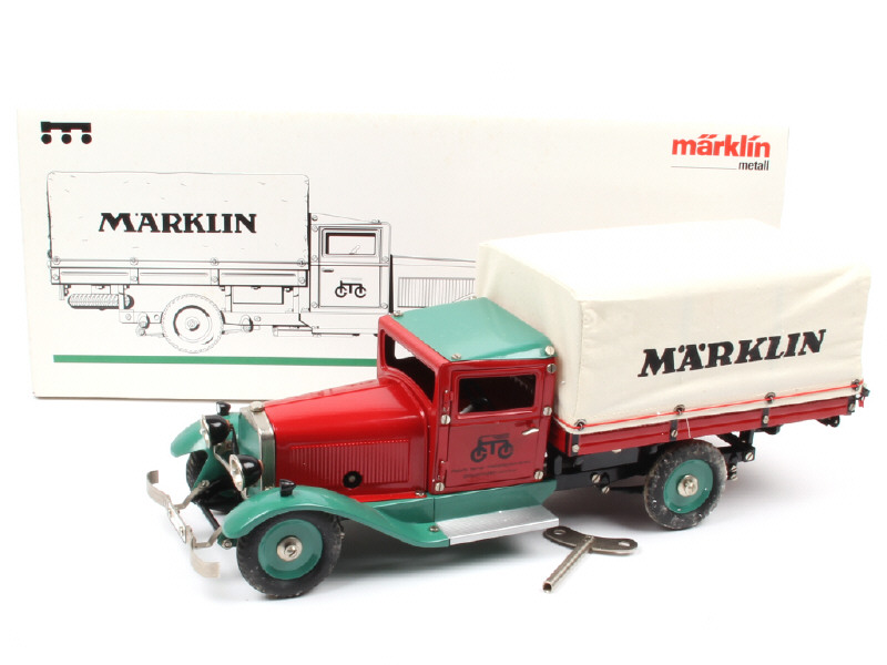 longueur 42,5 cm - avec moteur à clef (fonctionne) avec clef, certificat d'édition limité à 6600 exemplaires, direction par le volant & phares électriques (non testé) - pneus plus ou moins salis - ce modèle est une réédition réalisée en 1992 d'un camion fabriqué avant-guerre - SUPERBE REALISATION !