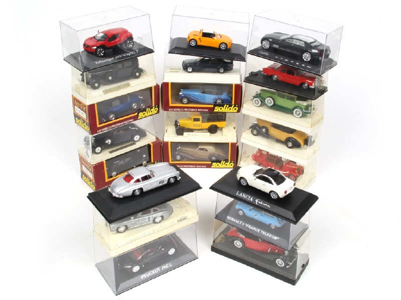 miniatures reproduisant notamment les modèles : RENAULT, MERCEDES, PACKARD, LANCIA, PEUGEOT & ROLLS ROYCE - principalement la marque SOLIDO & des collections presse - possibilité de petits manques & accrocs sur les boites