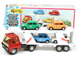 série COLOSO - longueur 36 cm - petites traces d'humidité par endroits - légers manques sur les décalques - avec petites déformations, jantes fondues sur les voitures & un pare-chocs cassé & recollé