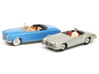 états de 'A' à 'B' - comprend : PEUGEOT 403 (nombreuses parties repeintes telles que l'aménagement intérieur, capote & roues, manque conductrice) & MERCEDES 190 SL (volant à refixer, petits frottements sur le pare-choc avant)