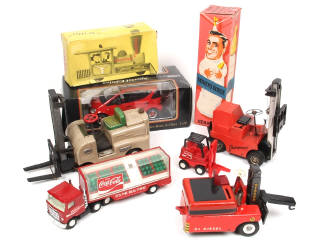 états de 'A+' à 'D' - comprend : MERCEDES CLASSE A, MACK COCA COLA & 3 FORK LIFT - on y retrouve notamment les marques : MAISTO, BUDDY & MASUDAYA - avec manques, parties cassées & repeintes - on y joint 2 boites vides de train WAMOO (état 'd') & ARMAGNAC DUCASTAING (état 'c')