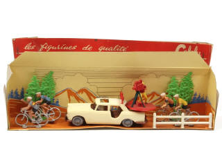 contient : une PEUGEOT 404 avec plateau-caméra & caméraman, 4 coureurs cyclistes (dont un décollé du socle), 2 arbres & une barrière - ensemble plus ou moins encrassé