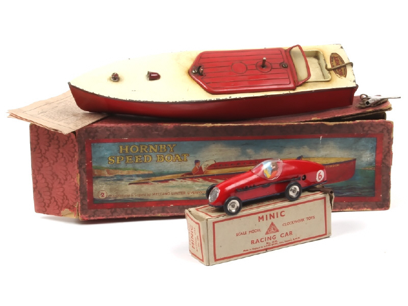 longueur 34 cm - moteur à clef (fonctionne) avec clef & notice - avec cales de boite - on y joint une voiture de courses de la marque TRI-ANG MINIC - moteur à clef (fonctionne) avec clef - longueur 14 cm ('B-c')