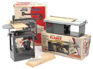 états de 'B' à 'C' - non testé - comprend : scie sauteuse sur socle & table de coupe - petits manques de peinture & d'accessoires - boites en état 'c' - on y retrouve les marques : NOMURA & ROSKO