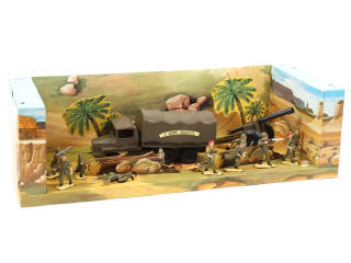 réalisation en plastique - dimensions du coffret : 55,5x22x16 cm - contient : BERLIET GAZELLE bâché (21 cm), un canon & 12 soldats