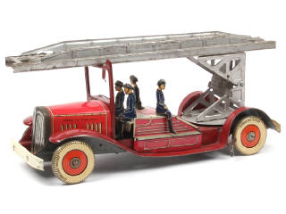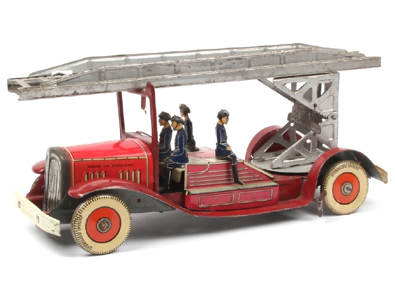 METTOY (GB) Camion grande échelle de pompiers en tôle lithographié rouge, jaune & argent