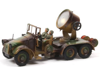 longueur 25 cm - avec moteur à clef (fonctionne), direction, phares & projecteur électriques (non testés) & 2 soldats allemands (craquelures avec une tête recollée) - quelques éléments, petites parties manquants (notamment le pneu de secours) & d'autres non d'origine - vitre de projecteur fêlée - légères traces d'oxydation avec frottements sur la carrosserie par endroits