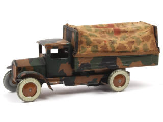 longueur 31 cm - avec moteur à ressort (à revoir) & direction - bâche tachée (manque quelques petites fixations) - craquelures de peinture sur la ridelle arrière - sans conducteur - carrosserie légèrement encrassée