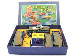 non testé - dimensions du coffret : 47 x 34 cm - contient : une SIMCA VERSAILLES à moteur électrique (modèle transformé d'origine sur base QUIRALU avec quelques éclats plus ou moins importants sur la carrosserie), 12 rails courbes, 6 rails droits (dont un d'alimentation) & un transformateur - possibilité de petits accessoires manquants