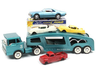 réalisation en tôle - longueur : 57 cm - manques quelques petits accessoires (2 petites perforations sur le toit) - avec 3 voitures (états de 'C' à 'D') - on y joint une OLDSMOBILE TORONADO (état 'A' - 'b') de la marque TAIYO (non testé)