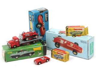 échelles différentes - états de 'A' à 'C' - miniatures reproduisant notamment les modèles : PORSCHE, AUSTIN, FERRARI & FORD - on y joint une voiture de course de la marque RENNER (moule SCHUCO) - très légers manques & accessoires cassés sur certains modèles - les boîtes sont en état 'b' à 'd'