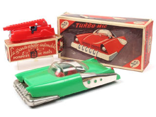 longueur : 26,5 cm - moteur à friction (fonctionne) - quelques fêlures sur le vitrage - parties chromées plus ou moins ternies - 2 fixations de bouclier avant incomplètes - on y joint un camion grande échelle de pompiers en plastique en état 'A'-'c' de fabrication française (un défaut de moulage sur le côté droit de la carrosserie)