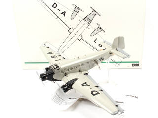 envergure 57 cm - moteur à clef (fonctionne) - verrière du cockpit ouvrant avec commandes des gouvernes, pilote, co-pilote & palonnier fonctionnel - le moteur entraîne les 3 hélices - avec notices - ce modèle en série limitée est une réédition d'un avion fabriqué avant-guerre - SUPERBE REALISATION !