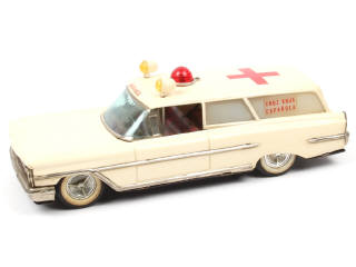 longueur 33 cm - avec moteur à friction (fonctionne), phares directionnels de toit & gyrophare électrique (non testé) - jantes légèrement fondues - traces d'oxydation par endroits notamment sur le plancher & dans le compartiment à pile - très légères retouches par endroits