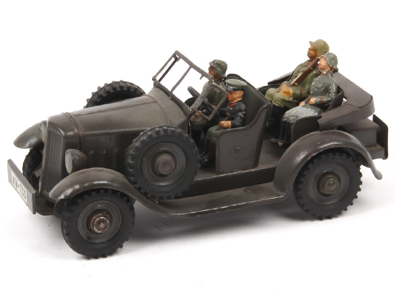 longueur : 20,5 cm - version sans moteur - avec direction & 4 soldats allemands (non conformes avec quelques fêlures dont une tête recollée) - quelques petites restaurations & retouches notamment sur les enjoliveurs de roues & l'entourage de pare-brise (cassé avec vitrage manquant)