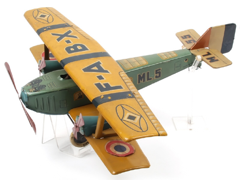 envergure : 46 cm - moteur à ressort (fonctionne) - avec cocardes françaises - quelques petits frottements sur la carrosserie par endroits (légères traces de vernis d'origine)
