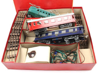 contient : une motrice électrique 1B1 711 (non testé), une voiture de voyageurs de 2ème classe, une voiture-lits, un transformateur & des rails (traces d'oxydation) - attelages ternis - manques de peinture plus ou moins importants sur les bogies - coffret légèrement taché & décoloré