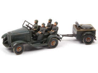 longueur de l'ensemble : 28 cm - avec moteur à clef (fonctionne), direction & 4 soldats allemands (un exemplaire non conforme aux 3 autres) - quelques frottements par endroits (notamment sur la cuisine & l'assise des banquettes - intérieur de cuve ternie