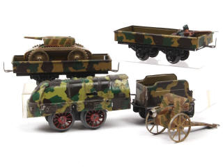 états de 'B' à 'C' - comprend : une locomotive à vapeur type 020 avec tender (moteur à clef à revoir, traces d'oxydation plus ou moins importantes) & 2 wagons plateaux - on y joint un canon en tôle (axe de roues non d'origine), un char (de fabrication allemande, moteur à clef fonctionne) & un soldat autrichien de la première guerre mondiale en composition