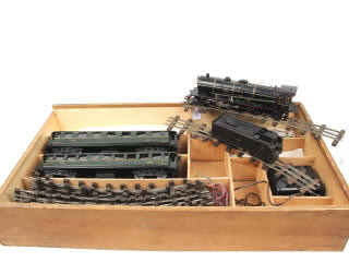 non testé - contient : une locomotive à vapeur type 231-612 avec tender, voitures de voyageurs (2 exemplaires différents avec manques de peinture plus ou moins importants par endroits), 13 rails, un aiguillage (de marque L.R) & un transformateur de la marque MECCANO - présenté dans un coffret bois - quelques légères retouches par endroits - possibilité de petits accessoires manquants