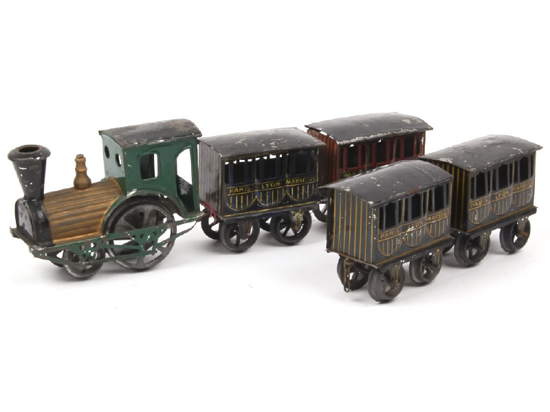 comprend : locomotive à vapeur (moteur à clé, fonctionne) & 4 voitures de voyageurs - éclats majeurs par endroits notamment sur le locomotive (quelques déformations) et les toits des voitures - quelques traces d'oxydation avec parties plus ou moins ternies