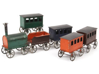 longueur de l'ensemble : 58 cm - comprend : une locomotive à vapeur avec tender & 4 voitures de voyageurs - quelques traces d'oxydation par endroits avec légères déformations