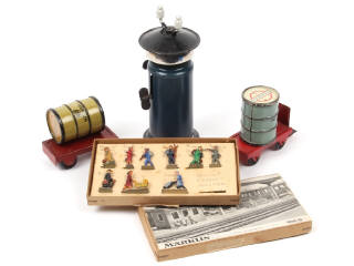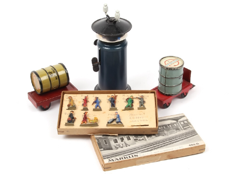 écartements différents - états de 'B' à 'C' - comprend : un signal sonore de voie (fonctionne), 2 chariots de gare (avec manques) & 2 fûts 'STANDARD' - on y joint un coffret de voyageur (référence 404G, un manquant) en état 'D'-'c'