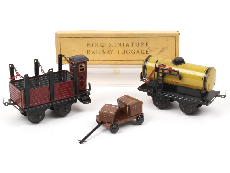 écartement '0' - comprend : un wagon tombereau à rancher avec guérite & citerne 'SHELL' - rayures, taches & frottements plus ou moins importants par endroits - on y joint un coffret (état 'c', décoloré) 'RAILWAY LUGGAGE' contenant un chariot & 2 bagages (un manquant) de la marque 'BING'