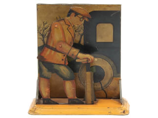 dimensions : 11 X 7 X 12 cm - une manivelle permet de faire bouger les bras & le haut de la pompe à main afin de simuler le gonflage d'une roue - très légères déformations avec petites traces d'oxydation (principalement sur le socle avec une petite perforation)
