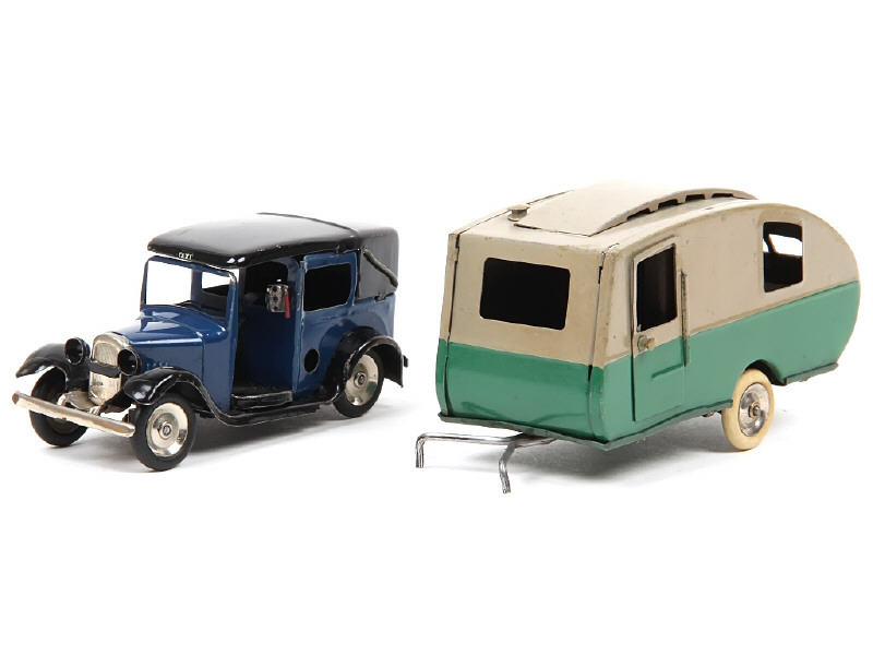 longueur 10,5 cm - avec moteur à clef (fonctionne) & direction - pneus séchés - manques sur les décalques - quelques petits frottements par endroits - on y joint une caravane de la marque (état 'C') avec petites retouches par endroits & attelage non d'origine