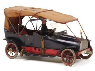 longueur : 17 cm - avec moteur à ressort (fonctionne) & direction - une roue & vitre de pare-brise non d'origine - capote jaunie, légèrement tachée & déchirée - petites traces d'oxydation par endroits - conducteur à refixer