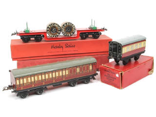 états de 'B' à 'C' - comprend : 2 voitures de voyageurs & un wagon-plateau porte bobines - boîtes plus ou moins tachées - possibilité de petits accessoires manquants