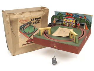 réalisation en bois - contient : un plateau de jeu (30x30x13 cm) avec locomotive à vapeur, 2 voitures de voyageurs, différents décors & notice - un système avec contre-poids permet de faire avancer circulairement le train (fonctionne de manière aléatoire) - socle de plateau désolidarisé - annotations sur l'arrière du décor