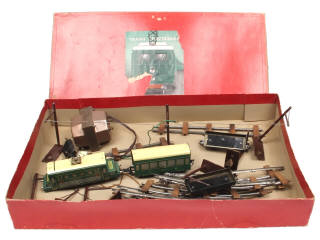 dimensions du coffret : 50 x 30 cm - contient : une motrice électrique 'SNCF' (moteur non testé), une voiture de voyageurs, 2 wagons plateaux, rails, accessoires de voie & un transformateur - avec quelques manques, parties cassées & plus ou moins ternies - les accessoires sont en état 'C' - sans cale de boîte - boîte tachée avec illustration incomplète