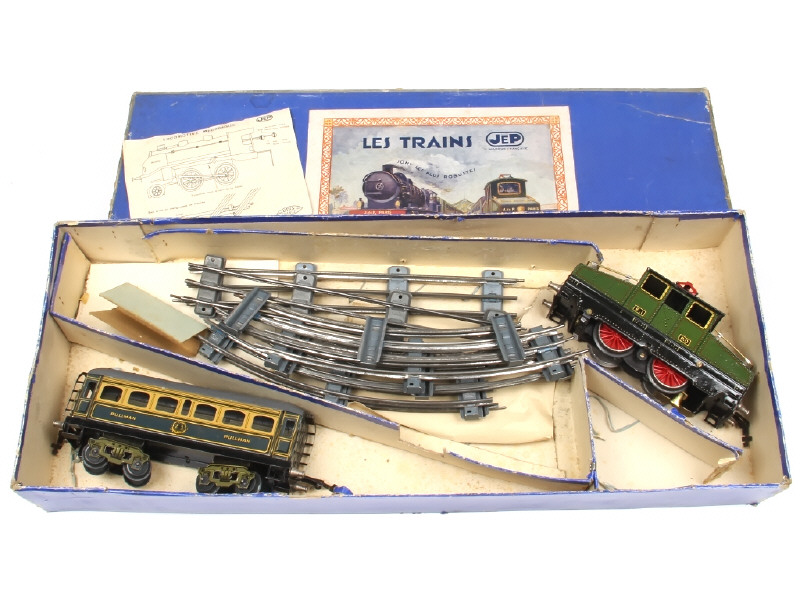 dimensions du coffret : 70 x 27 cm - contient : une motrice 5470 'boîte à sel' (JdeP, fonctionne), une voiture de voyageurs PULLMAN, 7 rails (ternis) & notices (dont certaines non conformes au contenu) - avec manques
