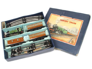 dimensions du coffret : 40 x 35 cm - contient : une locomotive-tender type 020 'LNER' (moteur à clef fonctionne, sans accessoire), wagon-fourgon à bagages, 2 voitures de voyageurs de première & 3ème classe, 14 rails (légèrement ternis), clef, notice & cales de boîte - quelques frottements plus ou moins importants par endroits (principalement sur la locomotive) - petits manques sur l'illustration de boîte